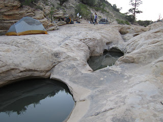 After 14ish miles of hiking on the first day, we set up camp on this nice sandstone. It felt good to kick off my sandy shoes and walk around barefoot on the warm stone. The place was beautiful, but frogs loved it too: there were some really loud ones that night.